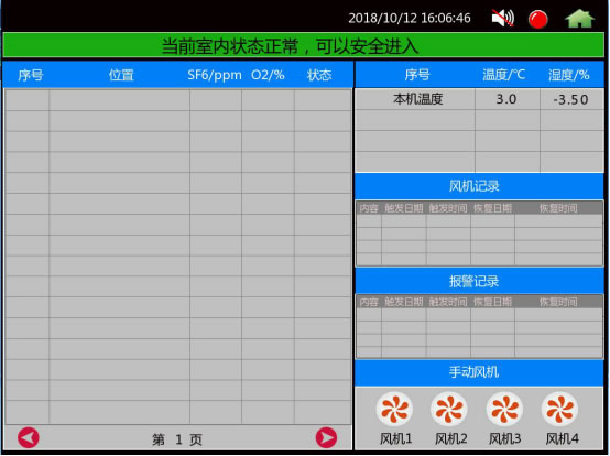 3-3 主機(jī)控制器圖 ★ SF6濃度檢測(cè)范圍:0~1500ppm或定制。 ★ SF6氣體檢測(cè)靈敏度:±1%設(shè)置值。 ★ O2濃度檢測(cè)范圍:0~25%。 ★ O2測(cè)量精度:<0.5%。 ★ 缺氧報(bào)警閥值:18.0%(可調(diào))。 ★ 溫度顯示范圍:-30~99℃。 ★ 濕度顯示范圍:0~99%RH。 ★ 數(shù)據(jù)記錄功能:報(bào)警事件自動(dòng)記錄,海量存儲(chǔ),自動(dòng)更新。 ★ 報(bào)警輸出:繼電器空接點(diǎn)輸出,可與RTU相連,支持RS485報(bào)警輸出。 ★ 支持RTU遠(yuǎn)程啟動(dòng)風(fēng)機(jī)功能。 ★ 支技紅外人體檢測(cè),自動(dòng)啟動(dòng)風(fēng)機(jī)或語(yǔ)音提示。 ★ 風(fēng)機(jī)控制器:開關(guān)型:直接控制風(fēng)機(jī)電源;脈沖型:與風(fēng)機(jī)控制開關(guān)相連?筛鶕(jù)現(xiàn)場(chǎng)情況選配。 ★ 風(fēng)機(jī)啟動(dòng)支持多種模式:定時(shí)啟動(dòng)、報(bào)警啟動(dòng)、、遠(yuǎn)程啟動(dòng)、手動(dòng)啟動(dòng)等。 ★ 通過RS485支持測(cè)量數(shù)據(jù)遠(yuǎn)傳輸出如:門口安裝大型LED顯示屏,遠(yuǎn)處立即看到測(cè)量參數(shù)和系統(tǒng)運(yùn)行情況 (需用戶另行選配) 。 ★ 支持通信測(cè)試功能。 四、技術(shù)指標(biāo)1.SF6氣體濃度報(bào)警范圍: 0~1500PPM(報(bào)警點(diǎn)可自行設(shè)置,國(guó)家規(guī)定1000PPM) 2.SF6氣體檢測(cè)靈敏度: 1PPM 3.O2濃度報(bào)警范圍: 0~25%,缺氧報(bào)警點(diǎn)18% 4.O2測(cè)量精度: <1%FS 5.溫度顯示范圍: -30~99℃ 6.濕度顯示范圍: 0~99%RH 7.輸入電源: 85~265V AC 8.報(bào)警輸出點(diǎn)電源: 2A 9.風(fēng)機(jī)輸出觸點(diǎn)電源: 16A 10.風(fēng)機(jī)通風(fēng)時(shí)間設(shè)定: 15MIN/次或用戶任意設(shè)定 11.?dāng)?shù)據(jù)記錄容量: 10000條 12.通訊: RS-485標(biāo)準(zhǔn)協(xié)議 9.1系統(tǒng)檢測(cè)主界面