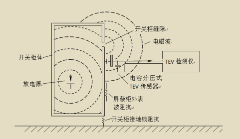特高頻監(jiān)測(cè)原理圖 2 暫態(tài)地電波法監(jiān)測(cè)原理 高壓開(kāi)關(guān)柜發(fā)生局部放電時(shí),放電量往往先聚集在與接地點(diǎn)相鄰的接地金屬部位,形成對(duì)地電流,在設(shè)備的金屬表面上傳播。對(duì)于內(nèi)部放電,放電量聚集在接地屏蔽的內(nèi)表面,屏蔽連續(xù)時(shí)在設(shè)備外部很難檢測(cè)到放電信號(hào),但屏蔽層通常在絕緣部位、墊圈連接、電纜絕緣終端等部位不連續(xù),局部放電的高頻信號(hào)會(huì)由此傳輸?shù)皆O(shè)備屏蔽外殼。根據(jù)麥克斯韋電磁場(chǎng)理論,局部放電現(xiàn)象的發(fā)生產(chǎn)生出變化的電場(chǎng),變化的電場(chǎng)激起磁場(chǎng),而變化的磁場(chǎng)又會(huì)感應(yīng)出電場(chǎng),這樣,交變的電場(chǎng)與磁場(chǎng)相互激發(fā)并向外傳播,形成了電磁波。當(dāng)開(kāi)關(guān)柜的內(nèi)部元件對(duì)地絕緣發(fā)生局部放電時(shí),小部分放電能量會(huì)以電磁波的形式轉(zhuǎn)移到柜體的金屬鎧裝上,因柜體接地,電磁波在開(kāi)關(guān)柜外表面感應(yīng)出高頻電流,利用電容耦合即可測(cè)出放電脈沖信號(hào)。